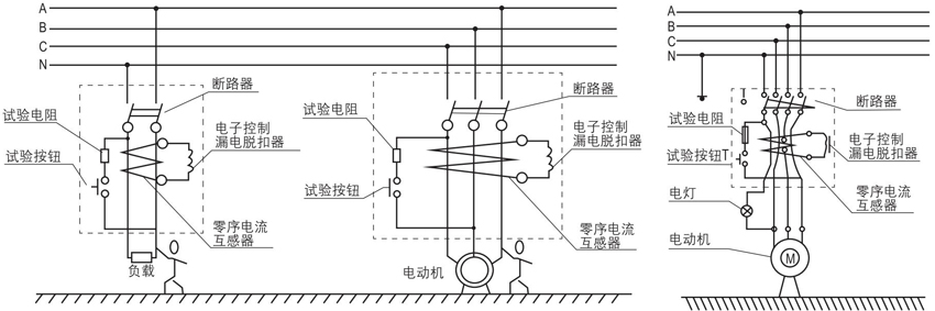 ▲当被保护电路中有漏电或人身触电时,只要剩余电流达到整定 动作电流值,零序互感器的二次绕组的输出信号就触发可控硅 导通,并通过漏电脱扣器使漏电断路器动作,从而切断电源起 到漏电和触电保护作用。
